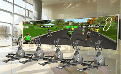 多人分别在多台椭圆机上,面对一个大屏幕赛跑,非常适合团队赛跑和体能拓展,跑步锻炼和游戏比赛融合在一起,专业性、趣味性兼而有之。还能边跑步边浏览世界各地美景,“跑”遍全世界。