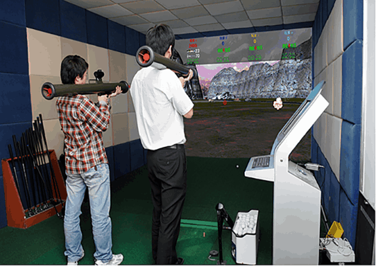多人对着大屏幕进行火箭筒射击训练,可支持火箭筒射击多种坦克的训练,可用于火箭筒射击训练和反恐训练。