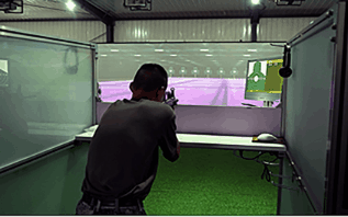 多人对着大屏幕进行手枪或步枪等枪支的射击训练,可支持固定靶、移动靶、隐现靶、真人实景射击和其他虚拟射击目标的训练,可进行反恐训练。