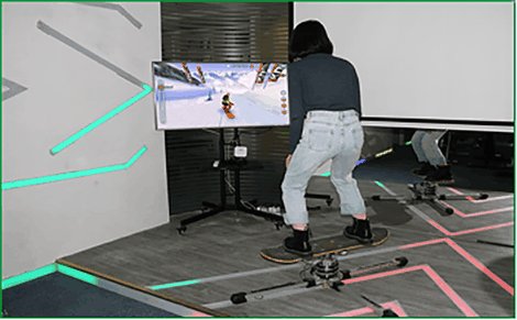 在乐动模拟滑雪系统中,用户在单板或双板模拟台上运动,检测系统检测运动的速度和方向,在屏幕上模拟滑雪的动态画面,如同在户外滑雪一样,可以提升滑雪技能,锻炼平衡力和核心肌群。