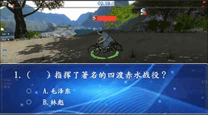 在骑行、跑步、划船或射箭过程中边运动,边在平板电脑或手机上的乐动运动APP或微信小程序上回答党建或业务知识的问题。答对后运动加速、答错减速,增加趣味性