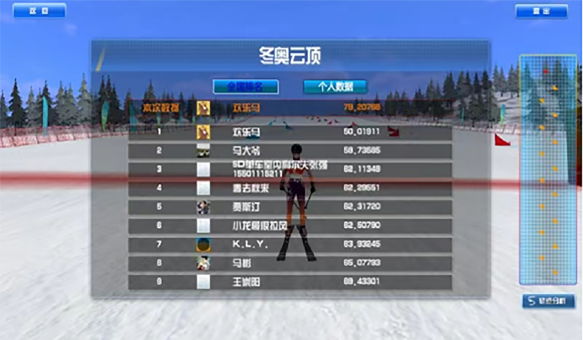 真实模拟滑雪赛道,设置旗门障碍,实时可看到旗门通过道数、错过道数和滑雪时间长短。